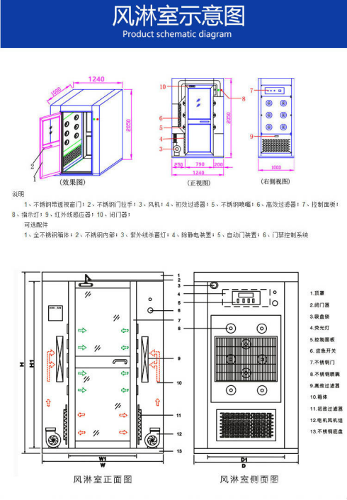 產品簡介:風淋室室人員進出潔凈室的必經通道,通用性強。主要用于電子加工、半導體行業、食品、飲料、生物、醫療等行業。是食品、飲料、生物、醫療行業QSGMP認證必須使用產品。除人物表面附著塵埃的同事起到氣閘的作用。風淋室是防止未經凈化的空氣進入潔凈區域的凈化設備。