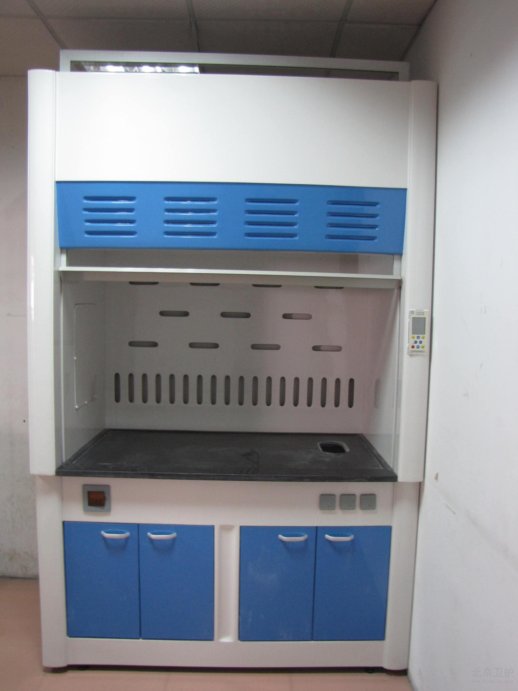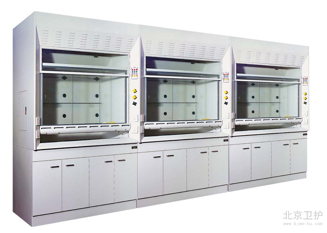 通風柜是實驗室家具中必不可少的一種。在實驗室中起到排風和換氣的功效。通風柜的結構是上下式,其頂部有排氣孔,可安裝風機。上柜中有導流板,電路控制觸摸開關,電源插座等 ,透視窗采用鋼化玻璃,可左右或上下移動。供人操作。下柜采用實驗邊臺樣式,上面有臺面,下面是柜體。臺面可安裝小水杯和龍頭。通風柜的材料由多種的,全鋼、鋼木、全木、鋁木、塑鋼、PVC結構等,其臺面是直接與操作者接觸的地方,由實芯理化板,不銹鋼板,PVC,陶瓷等材料組成。舊式通風柜多用木材制成,但現代多為涂有環氧樹脂的鋼材制造。常見柜寬為1000、1200、1500、1800和2000毫米幾個規格,深700-900毫米,高1900-2400毫米??晒?-3個人同時使用。 通風柜一般靠墻安裝。前方中間為可上下移動的透明門(多為玻璃),開啟高度一般為100-600毫米。門后為實驗進行的工作面,有水管、下水道、電源、真空泵、氣路管線等實驗需要的連接,上有帶保護罩的燈照明??諝庥晒駜惹吧戏降呐棚L扇抽走后,或經管道引到別處(稱為全通風),或經過濾重新循環使用(成為無管通風)。多數通風柜在(1)排氣量過?。?)前方玻璃門開啟過大的時候會發出警報,提醒操作者注意,一般玻璃門開啟后操作口風速不應低于0.5m/s,內部的排風扇速度和燈都有開關可調。使用的時候人站或坐于柜前,將玻璃門盡量放低,手通過門下伸進柜內進行實驗。由于排風扇通過開啟的門向內抽氣,在正常情況下有害氣體不會大量溢出。